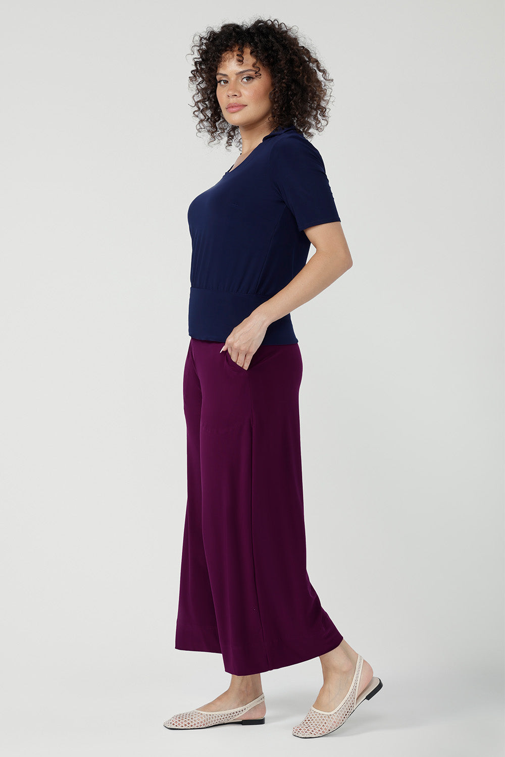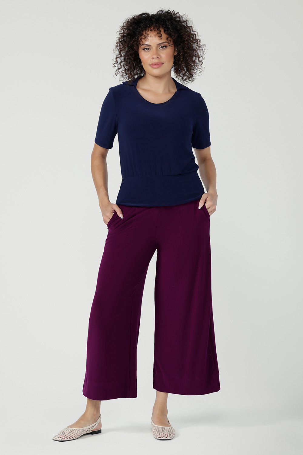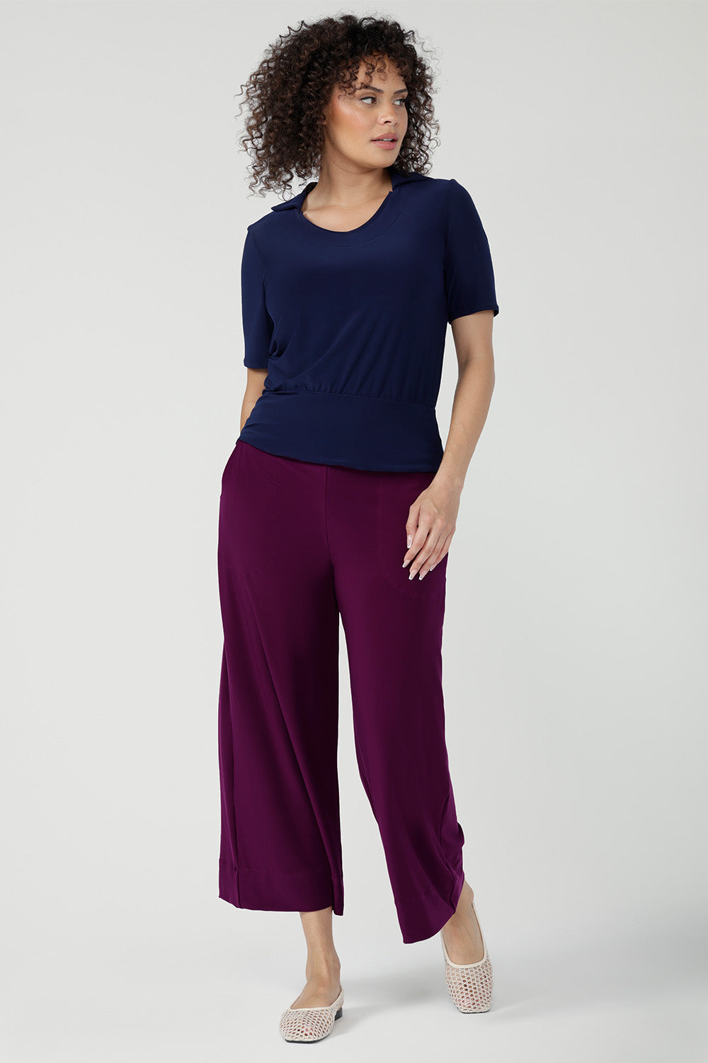 I’ve been wondering about these culottes for a while because I thought they be too wide on my pear shape. Not the case-the wide legs not only fit my larger thighs, but seem to balance out my proportions. I’m 162 cms, so bought the short length which is just right for the warmer months with a sandal or sneakers. I’m surprised that the heavyweight jersey is not too hot on a warm day, maybe the breeziness of the legs allows air circulation! Navy is such a versatile colour, a great staple in my wardrobe.