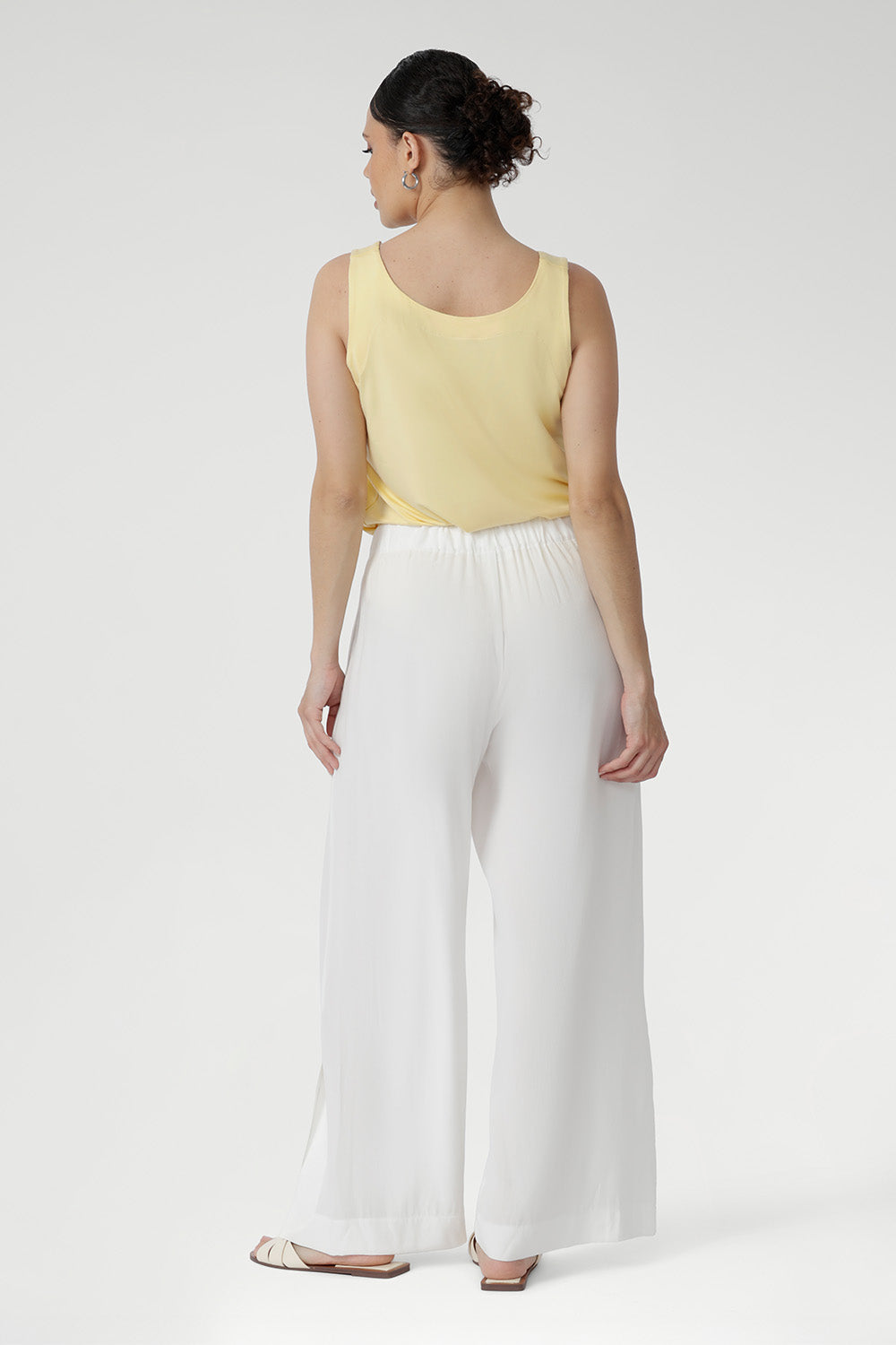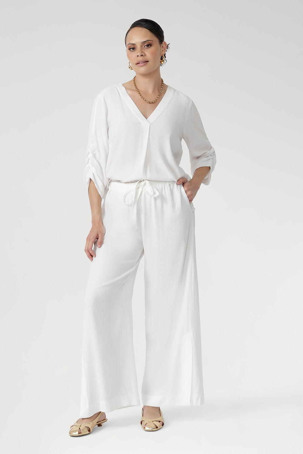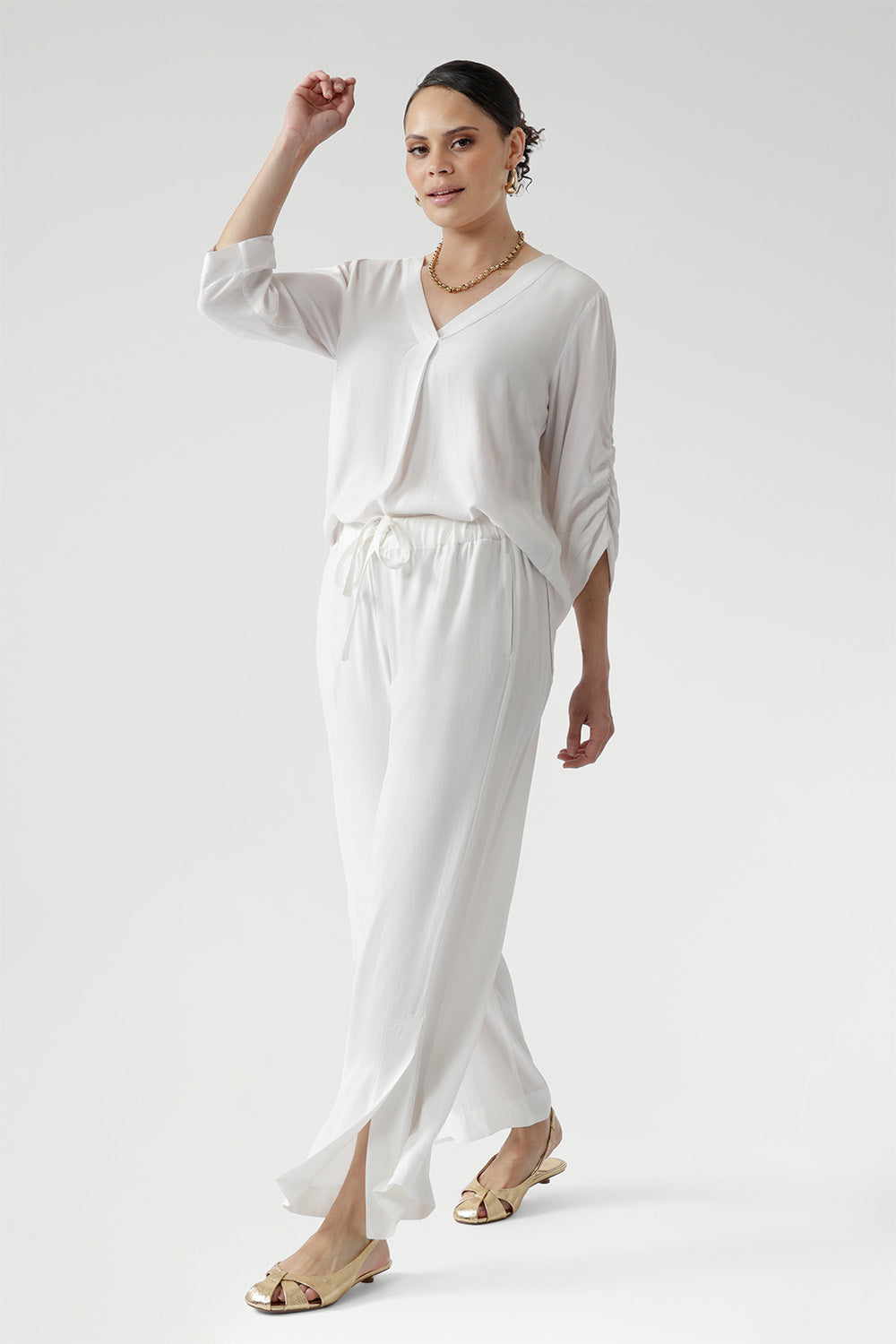 Crafted from a breathable Tencel-Viscose blend, the Devin Drawstring Pant in Vanilla is a lightweight essential designed for warm summer days. It features a straight-leg silhouette with an elasticated waistband and adjustable drawstring for comfort. Side pockets add practicality, while subtle hem slits create a touch of playful movement. Perfect for travel, casual outings, and everything in between, it’s a versatile staple with effortless appeal.