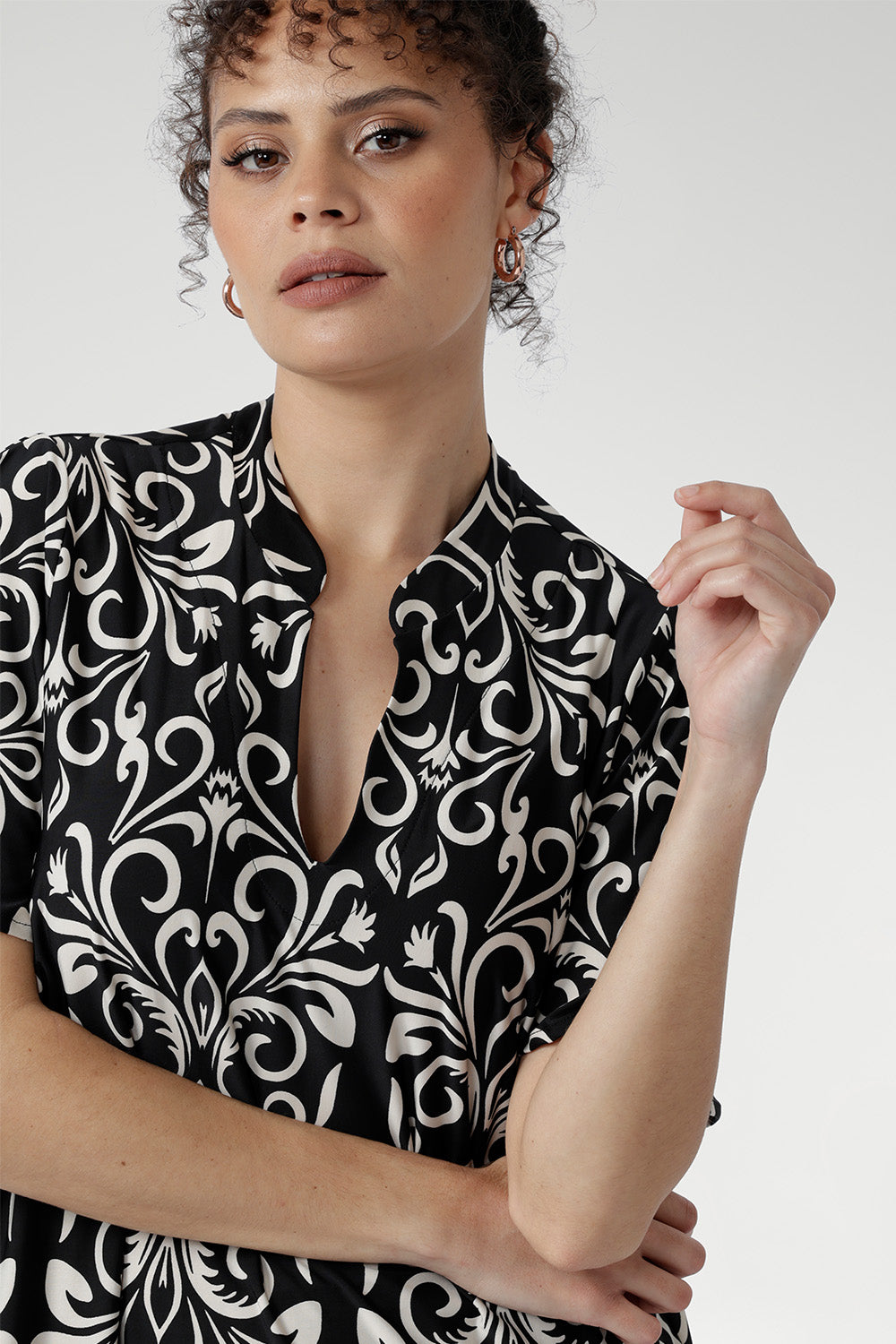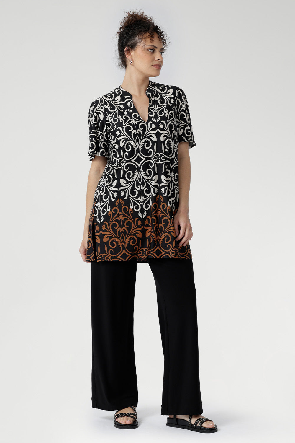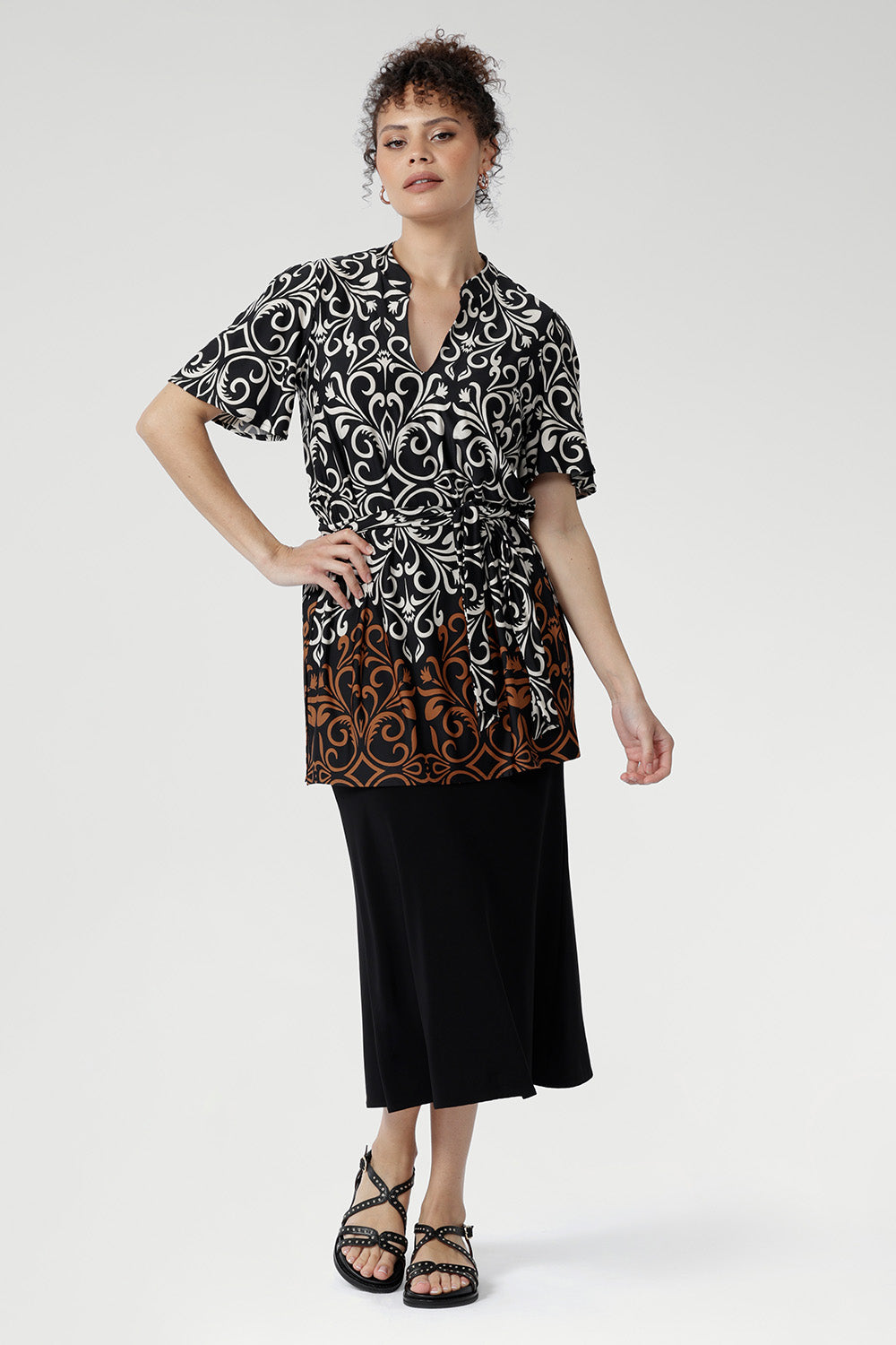 The Julia Tunic Top in Borderline is crafted from slinky jersey for a soft, fluid drape. Designed with a relaxed silhouette that falls below the hip, it flatters with ease and can be worn loose or cinched at the waist with its optional belt. Featuring a striking placement print, slit-style neckline, side slits, and back pleat, it’s perfect for vacations, travel, or evenings out—an effortless piece that brings polished ease to any occasion.