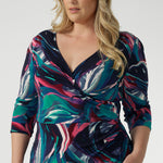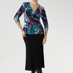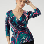 Crafted from our signature dry-touch stretch jersey, the Kyle Top is designed with professional style and all-day comfort in mind. Featuring a wrap bodice, 3/4 length sleeves, and a soft peplum waist seam that adds sophistication, and can be tucked into high-waist pants for a different look.