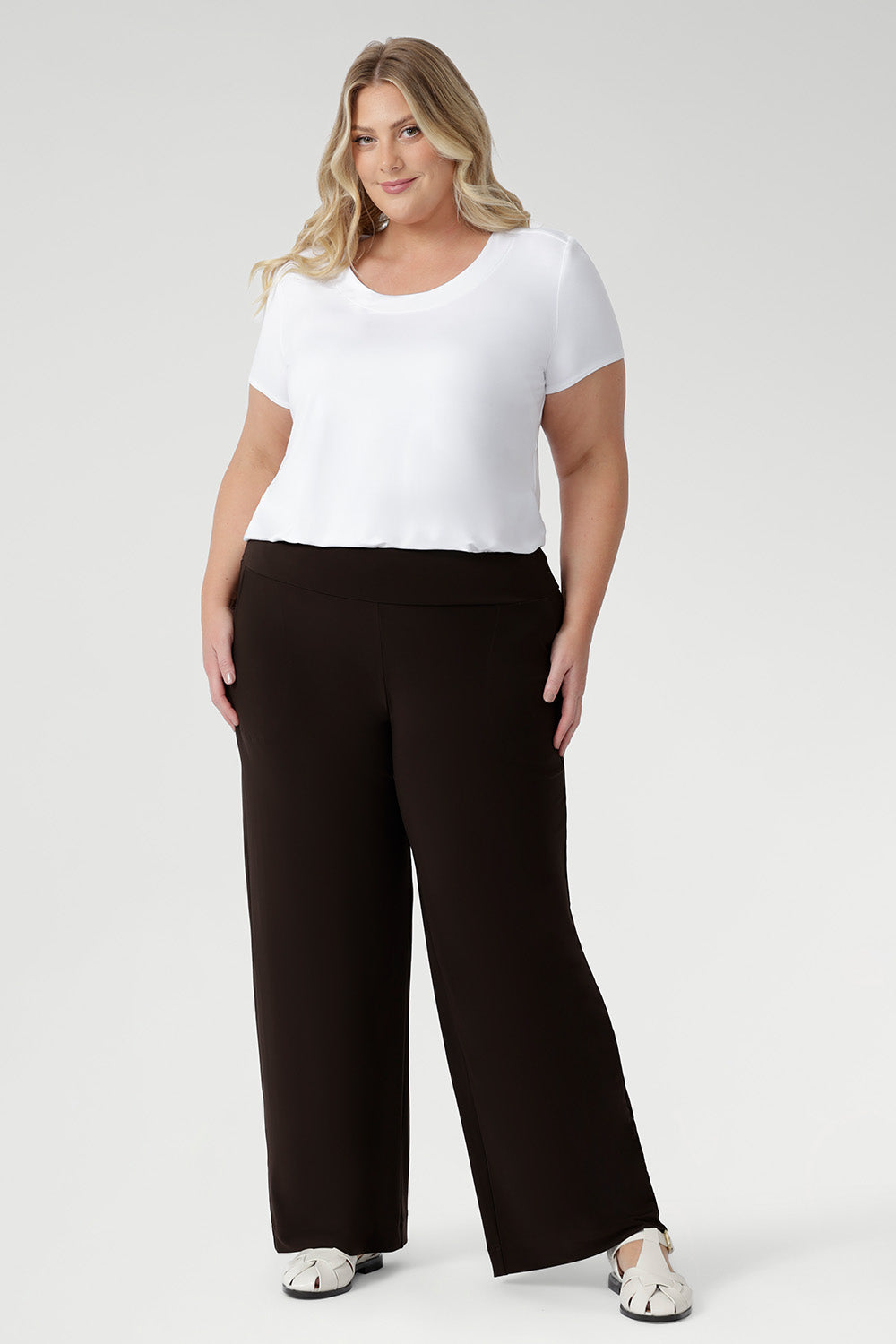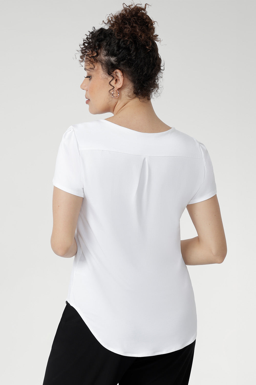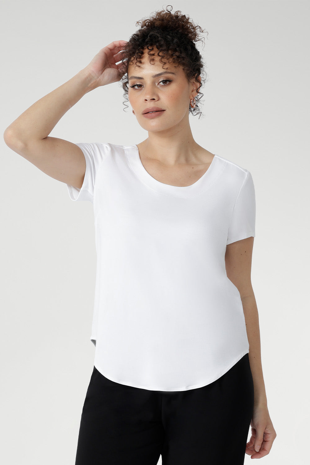Crafted from our bamboo jersey, the Sawyer Top in White Bamboo is an easy-wear top for both smart and casual occasions, featuring a round neckline, short fitted sleeves, and a shirttail hem. Works brilliantly as a layering piece and is the ultimate travel essential.